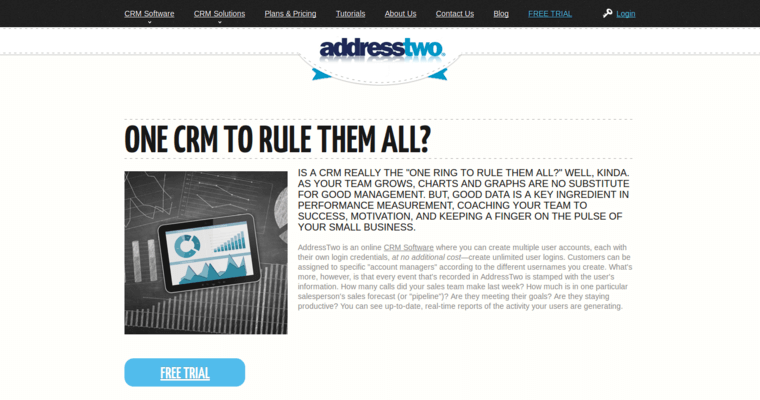 AddressTwo is an online CRM software application. It is designed for small businesses to use. It is installed on the cloud, which means that anyone in the organization can use it. There are no CD's to save on computer drives and so forth. It can be accessed anywhere there is an Internet connection. AddressTwo helps turn contacts into customers. It helps build relationships between a small business and its clients by providing easy-to-use tools for lead generation and networking. It is almost like having a shared personal secretary. It is very intuitive and doesn't take weeks to learn. It has built in tools to measure sales progress. The company offers a free trial of their product. They understand that small businesses need to build trust and relationships with their customers rather than simply dealing with them. They have a number of testimonials from clients on their website that attest to this.