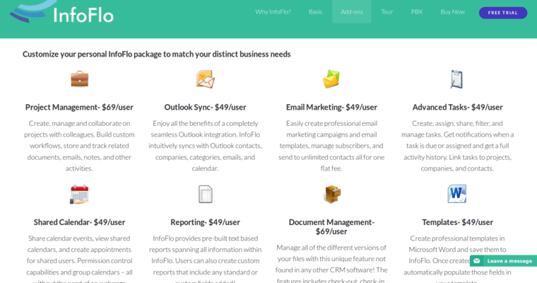 You can get InfoFlow for a low one-time per-user cost for the basic package. When you do, you'll own your data and enjoy world-class CRM without any monthly fees. The low price also includes lifetime updates. With so much to love, you might wonder how your business ever survived without InfoFlow. When you choose this CRM, you also get powerful options that can make your business thrive. Online forms, for example, can speed workflows and improve productivity for a small monthly rate. Other available addons give you the chance to make InfoFlo precisely fit your organization. Integration with Outlook, project management applications, advanced tasks and invoicing can automate tasks and help you and your team do more with fewer people. You can also use InfoFlow to manage lead acquisition and processing and follow contacts throughout the customer lifecycle.
