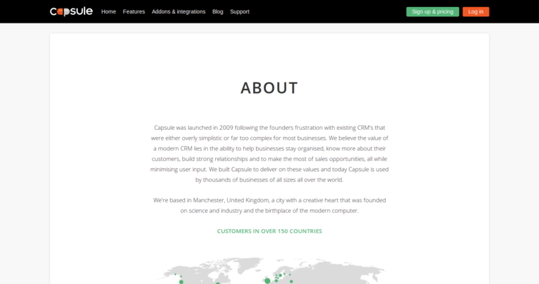 Since the founding of Capsule in 2009, the company has grown to boast customers in more than 150 countries around the world. This innovative firm is based in Manchester, United Kingdom, and was created to address the customer relationship management needs of businesses who had been poorly served by other CRM providers in the past. The goal of the professional team members at Capsule is to give their client customer relationship management solutions that help them learn as much information about their customers as possible, keep their leads and customer files more organized, and creating stronger customer relationships that lead to better sales figures. Not only do they succeed at doing all of these things, but they achieve all of these things while minimizing the amount of time and effort their customers spend doing them. This dedication to solving customers' problems has made Capsule a leader in the CRM industry.